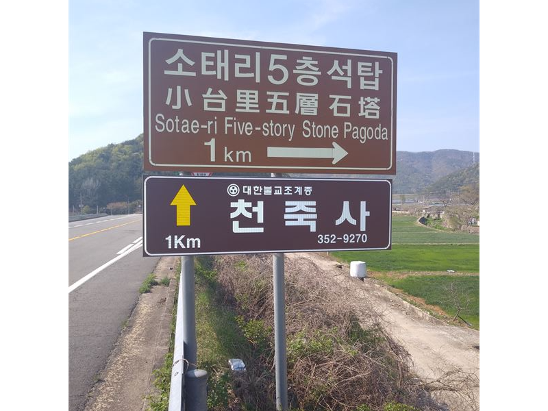 절 이름마저 잃어버린 채 아름다운 석탑 만이 홀로 옛터를 지키고 있는 소태리(小台里) 오층석탑(보물)을 찾아 나섰다. 밀양시청에서 출발해 신촌오거리에서 우회전한 후 국도 24호선을 따라 창녕·구기 방향으로 16km쯤 가면 도로변에 소태리 오층석탑 안내판이 보인다. 여기서 오른쪽으로 난 좁은 길을 따라 300m쯤 가면 천죽사 안내 표지석이 있는데, 이곳에서 우회전한 후 골짜기로 난 길을 따라 700m쯤 들어가면 주차장이 나온다. 주차장 앞쪽의 왼편으로 보이는 높다란 탑이 소태리 오층석탑이다.