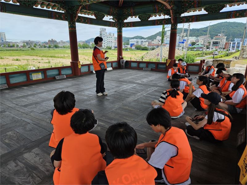 언양읍성의 동헌과 객사자리를 내려다 보며 해설을 듣고있는 자유학기제 학생들
