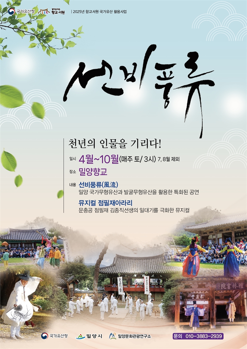 밀양시는 오는 5일(토) 오후 3시 밀양향교에서 “2025년 향교·서원 국가유산 활용사업”의 일환으로 운영하는“선비풍류”공연을 시작한다고 밝혔다. 이번 공연은 밀양지역의 무형문화유산, 발굴무형문화유산과 밀양아리랑을 접목한 공연으로 구성될 예정이다.