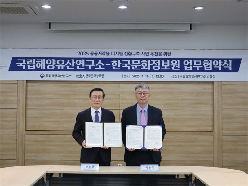 국가유산청 국립해양유산연구소(소장 이은석)는 한국문화정보원(원장 정운현)과 4월 16일 오후 1시 국립해양유산연구소(전남 목포시)에서 「공공저작물 디지털 전환 구축 사업」 추진을 위한 업무협약을 체결한다.