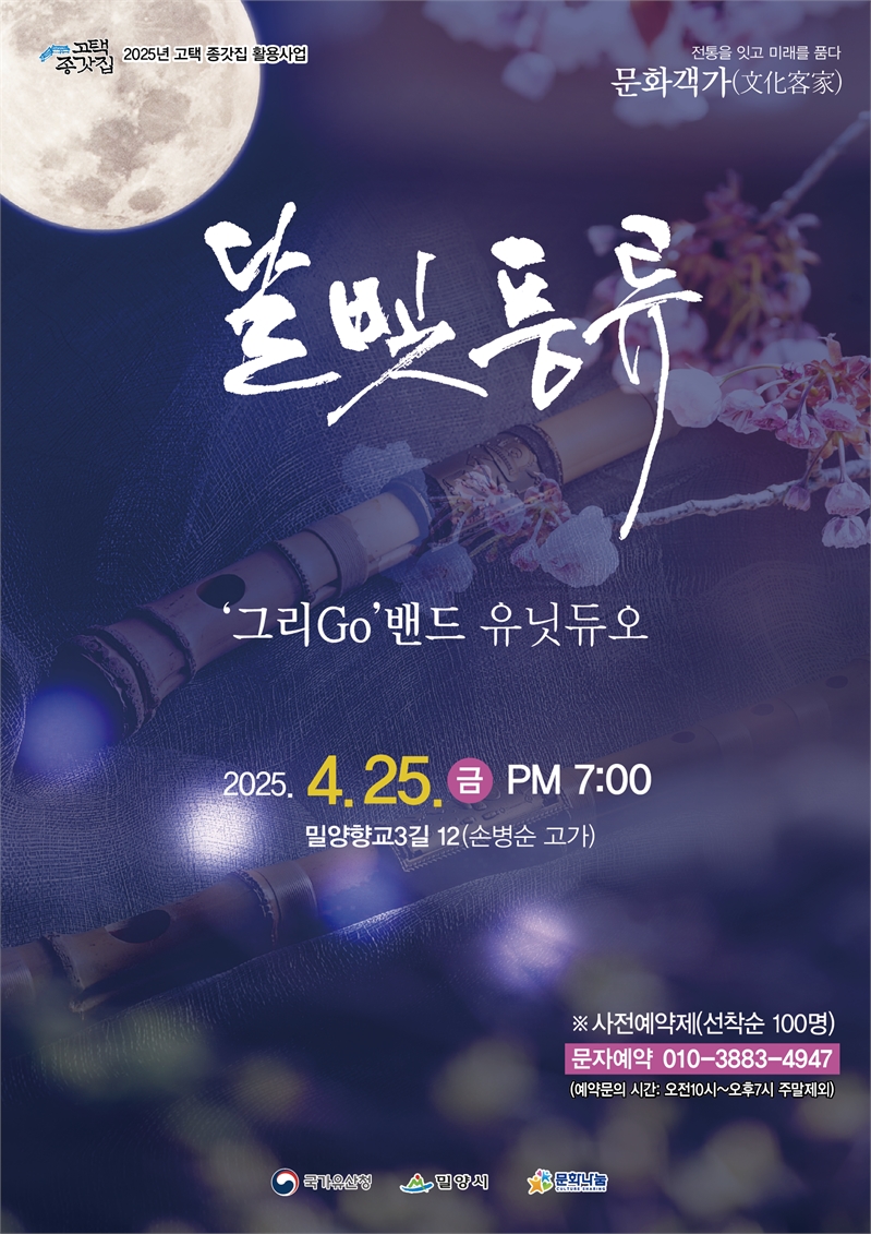 밀양시(시장 안병구)는 오는 25일(금) 오후 7시 교동 손병순 고가에서“2025년 고택종갓집 활용사업”의 일환으로 운영하는“달빛풍류”공연을 시작한다고 밝혔다.