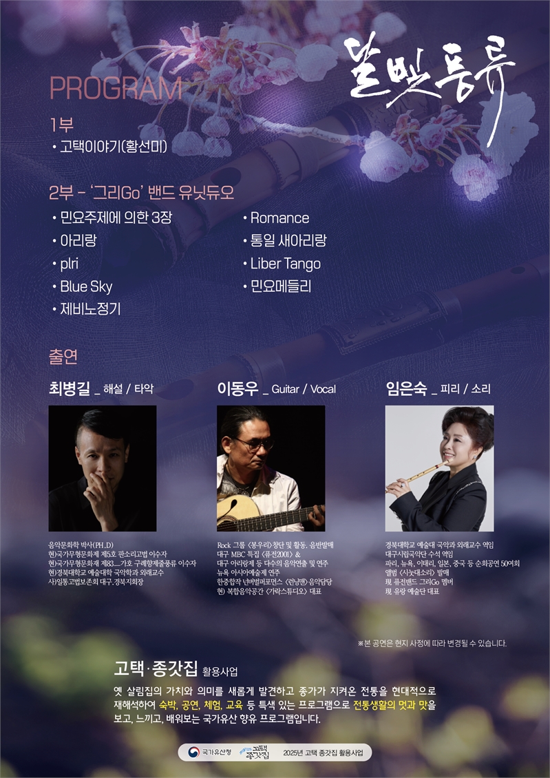 이번 사업은 공연뿐만 아니라 지역의 문화유산을 탐방하는‘선비들의 소풍’, 종갓집 전통문화를 체험하는‘종부들의 하루’등 다양한 프로그램이 함께 진행될 예정이다. 프로그램 참여에 대한 자세한 내용은 밀양시 누리집에서 확인할 수 있다.