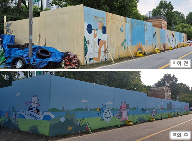 잠실한강공원 쓰레기적환장가림막 벽화조성 전/후 사진