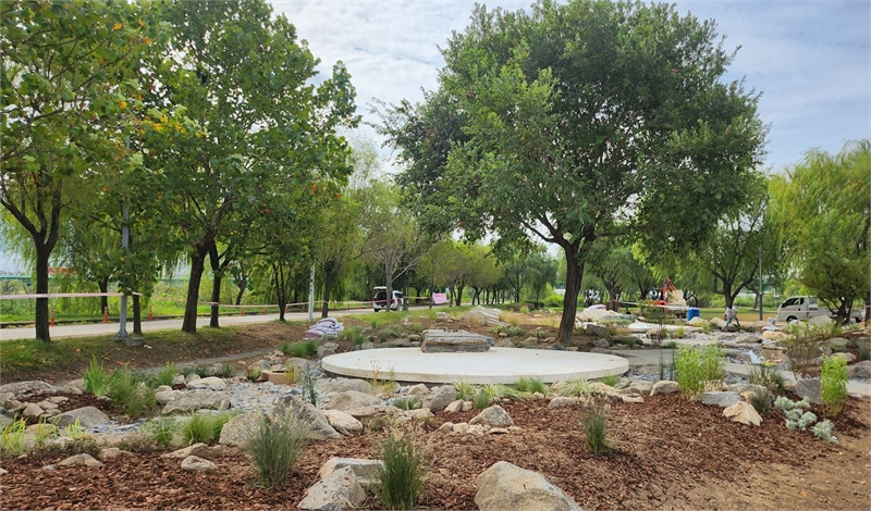 낙동강의 기존 왕버들·능수버들을 배경으로, 선을 형상화한 인공 구조물을 설치했으며, 그 사이에 하천에서 잘 자라는 억새, 수크렁 등 초화류 1,600본과 용버들, 나무수국 등 수목 105주를 식재해 자연과 예술이 조화를 이루는 정원을 연출했다. 특히 정원 한가운데 자리한 큰 버드나무 아래에는 ‘겸재 라운지’가 마련되어 있어, 잠시 쉬어가며 마치 산수화 속에 들어온 듯한 풍경을 감상할 수 있다.