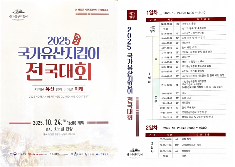 이틀간의 대회는 국가유산청(청장 허민)과 (사)한국국가유산지킴이연합회(회장 최호운)가 공동 주최하고, 충북문화유산지킴이(대표 연복흠)가 주관했으며, 충청북도·단양군·신협중앙회 등이 후원했다.