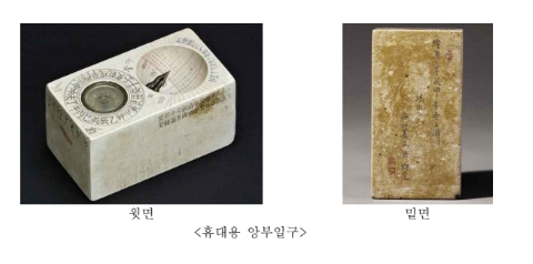 서울역사박물관 소장의 「휴대용 앙부일구(携帶用 仰釜日晷)」는 표면을 반구형으로 오목하게 파고 그 중심에 영침(影針)을 세웠고, 그 옆에 나침반을 붙여 남북을 정확하게 맞춘 후 시간을 측정하도록 제작되었다. 반구면(半球面)이 정확히 절삭되어 명확한 절기(節氣)선과 시각(時刻)선이 제작되었고, 백동으로 제작된 영침을 은도금하는 등 제작 기법이 우수하다. 또한 다수의 해시계를 제작한 진주강씨 가문이 제작한 것으로 밑면에 제작 연대(융희 2년, 1908년)와 제작자(강문수)를 새겨 놓아 과학사적 자료로 가치도 높다.