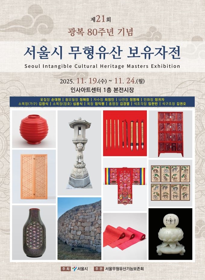 서울시 11월 19일(수)부터 24일(화)까지 종로구 ‘인사아트센터’에서 서울시 무형유산 기능보유자 연합 전시회를 개최한다고 밝혔다. 이번 전시에서는 전통의 기술과 아름다움을 지키기 위해 일평생을 바쳐온 서울시 무형유산 보유자 11명의 수준 높은 작품과 기술의 정수를 확인할 수 있다.