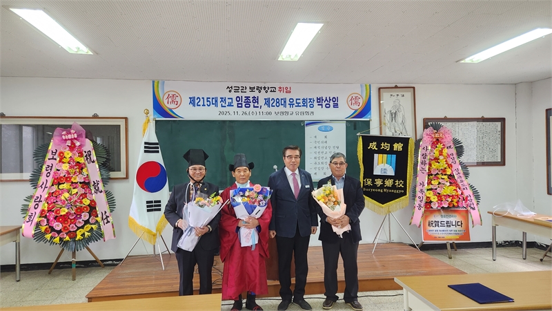 재단법인 충청남도 향교재단 보령향교(保寧鄕校)는 26일 보령향교 대성전에서 고유례를 봉행하고, 이어 유림회관에서 제215대 전교 및 제28대 유도회장 이·취임식을 성대히 개최했다.