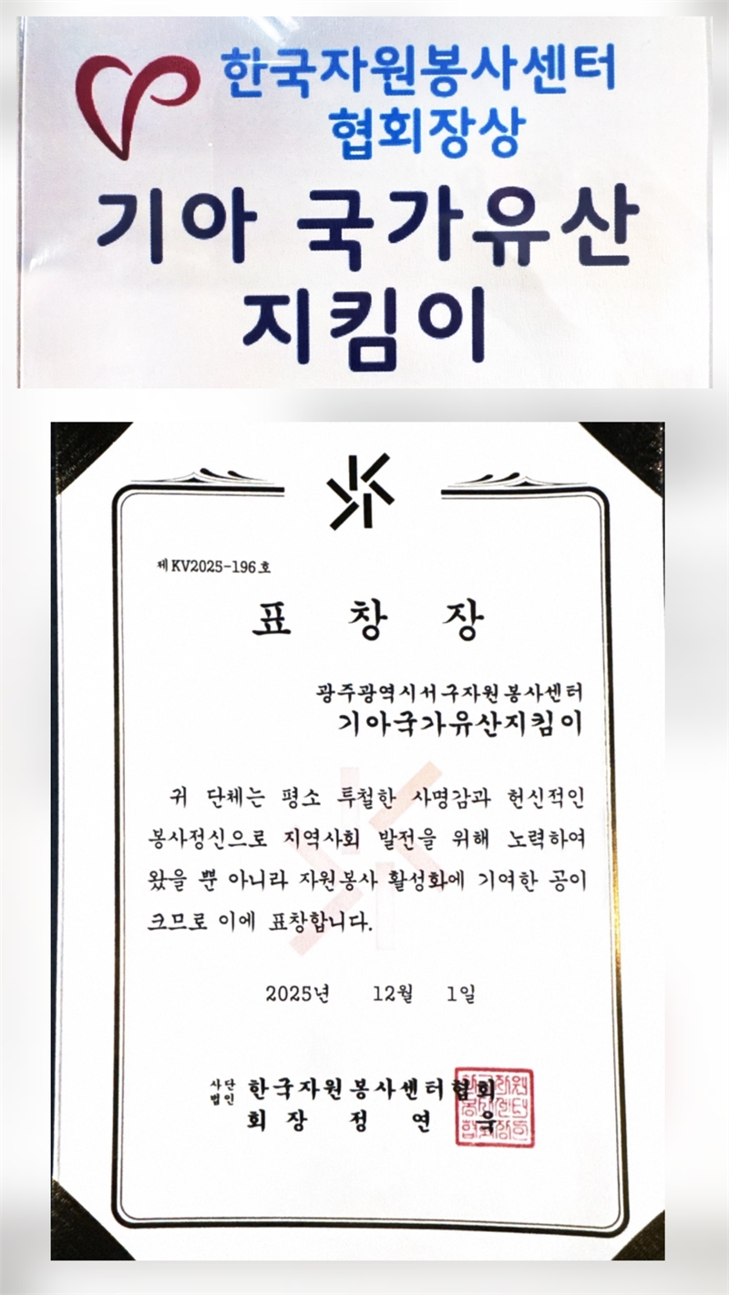 광주광역시 서구 지역의 기아국가유산지킴이(회장 한병기) 단체가 12월 8일(월), 광주시 일가정양립지원본부 3층 대강당에서 성황리에 개최된 '2025년 자원봉사자의 날 기념식'에서 '한국자원봉사센터 협회장상'을 수상하는 영예를 안았다. 이 단체는 서구 지역의 문화유산을 가족과 함께 바로 알고 보호하며 가꾸어 나가는 지킴이 활동을 꾸준히 펼쳐왔다. 특히, 서구 8경을 중심으로 청소년과 지역 주민이 함께 참여하는 다양한 프로그램을 운영하여 지역의 역사와 정체성을 되살리는 활동에 크게 기여한 공로를 공식적으로 표창받았다. 기아국가유산지킴이 단체는 지난 1년 동안 광주광역시 서구자원봉사센터와 연계하여 서구 관내 국가유산을 보존하고 관리하는 활동에 주력해왔다. 이들은 단순한 환경 정화 활동을 넘어, 지역 유적지의 가치를 알리고 시민들의 문화유산 보호 인식을 높이는 데 기여하며 지역 사회에 긍정적인 영향력을 전파한 점이 높이 평가되었다.