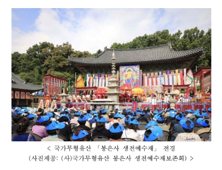 * 인정 현황: 김영이(자수장), 김영희(자수장), 최성우(궁중채화), 김영성(대목장), 이광복(대목장), 조재량(대목장), 정옥순(가야금산조 및 병창), 임진옥(대금정악), (사)국가무형유산 봉은사 생전예수재보존회(봉은사 생전예수재 보유단체)