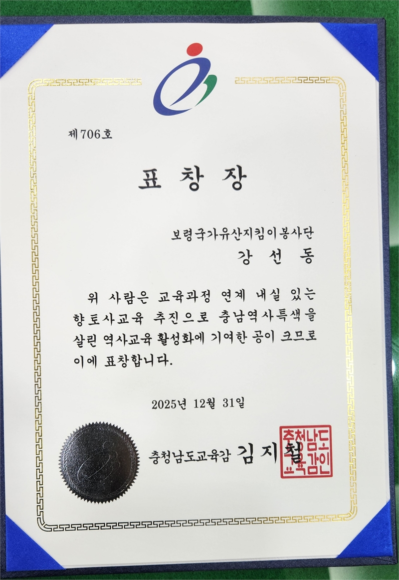 이어 “보령시는 앞으로도 시민이 주체가 되는 국가유산 보호·활용 활동을 적극 지원하고, 국가유산이 교육·관광·지역 발전으로 이어지는 선순환 구조를 구축해 나가겠다”고 강조했다.
