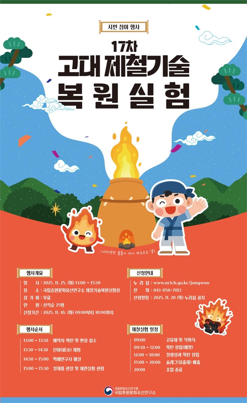 국가유산청 국립문화유산연구원 국립중원문화유산연구소(소장 조상순, 이하 ‘중원연구소’)는 오는 11월 25일(화) 오후 1시부터 중원연구소 제철기술 복원실험장(충북 충주시)에서 ‘고대 제철기술 복원실험 시민 참여 체험프로그램’을 운영한다. 이번 행사는 시민이 직접 참여하고 체험할 수 있는 문화형 학술행사로, 참가자들은