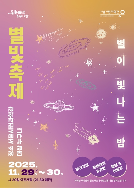 서울시립과학관은 11월 29일(토)부터 30일(일)까지 도심 한가운데서 토성의 고리와 안드로메다 은하를 직접 관측할 수 있는 특별한 천문 축제인 ‘2025 별빛축제–별이 빛나는 밤’을 개최하고, 가을 밤하늘의 대표 천체를 서울 시민 누구나 체험할 수 있는 천체 관측회와 천체 전문가의 강연, 과학문화 프로그램을 관람객에게