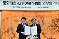 문화재청(청장 최응천)은 대한건축사협회(회장 석정훈)와 11월 24일(금) 국립고궁박물관(서울 종로구)에서 상호 협력과 교류를 통한 공동 발전을 위한 업무협약을 체결하였다. 주요 협약 내용은 ▲ 인재 양성을 위한 교육 기반(인프라) 공유 ▲ 전통건축과 현대건축의 조화와 발전을 위한 연구·학술활동 ▲ 문화재청과 대한건축사