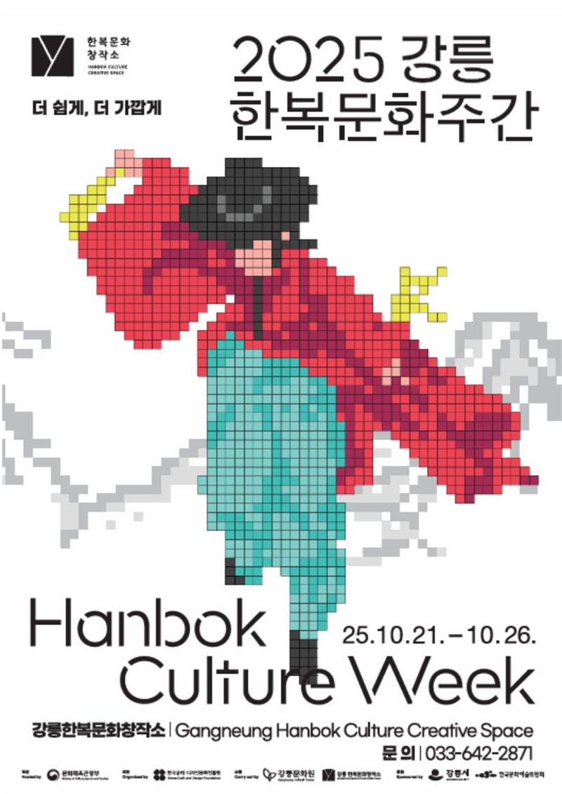 강릉한복문화창작소는 10월 21일(화)부터 10월 26일(일)까지 한복문화주간을 기념해강릉한복문화창작소 및 강릉일대에서 다양한 한복문화 프로그램을 운영한다.2025 한복문화주간은 문화체육관광부가 주최하고 한국공예ߴ디자인문화진흥원이 주관하며 우리의 멋과 전통이 담긴 한복을 널리 알리고 일상 속 한복 착용 문화를 확산하기 위
