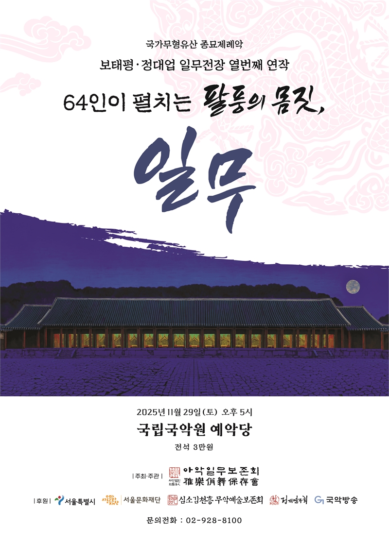 * 아악일무보존회 창립 10주년 기념, 종묘제례일무 전승의 결정체 선보인다. 사단법인 아악일무보존회가 창립 10주년을 맞아, 오는 2025년 공연을 선보인다. 이번 무대는 종묘제례일무 전장(全章) 24장 전체를 64인이 암기하여 선보이는 국내 최초의 대규모 공연으로, 그동안 제례 절차상 축약되었던 종묘제례일무의 전형을