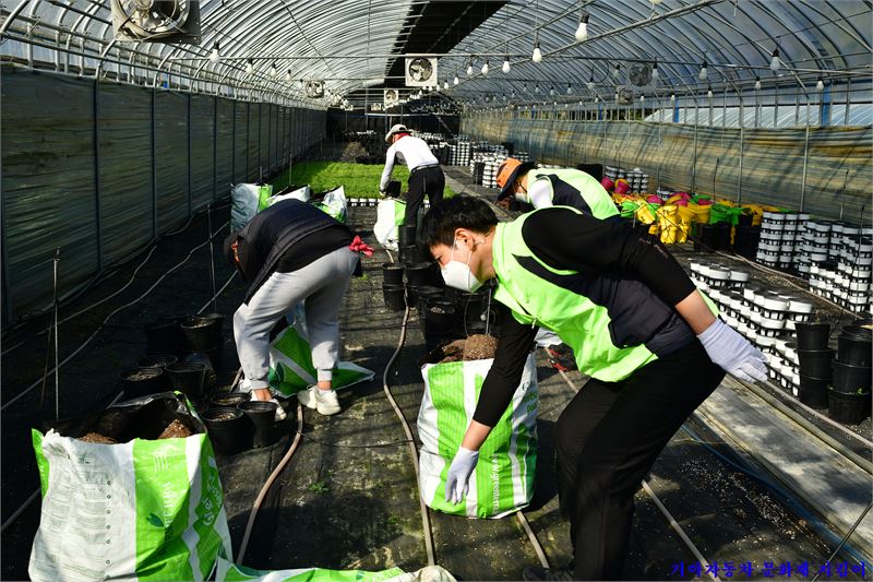 2021년 농촌일손돕기 봉사활동은 광주광역시 북구 지역 화훼농가의 일손 부족으로 어려움을 겪는 농가를 방문해 고춧대 뽑기, 화분상토 담기, 사용한 상토 흙제거 등 일손을 보태며 구슬땀을 흘렸다.