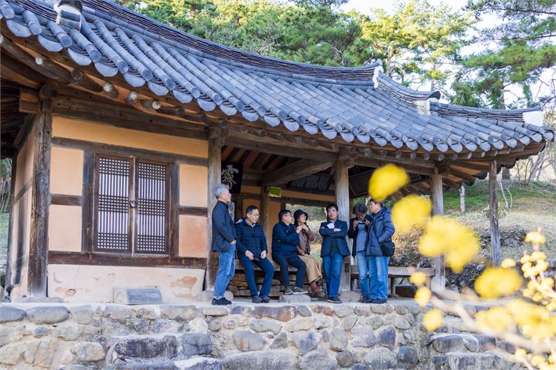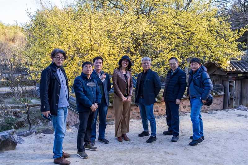 제월당 뜰 앞의 샛노란 산수유꽃 앞에서 단체사진
