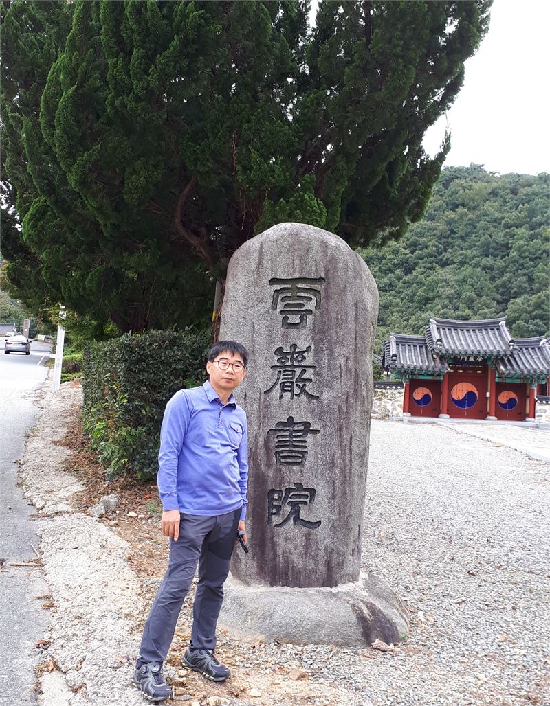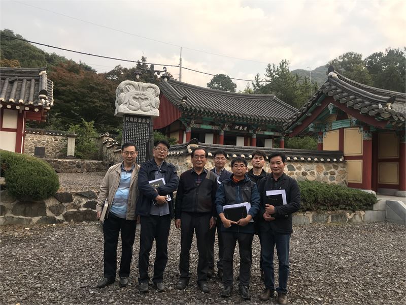 운암서원 묘정비 앞 홍주송씨 문중 관리자 송판길 선생님과 함께 단체사진