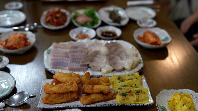 대한민국 대표 진수성찬, 홍어 삼합 정식 상차림의 모습