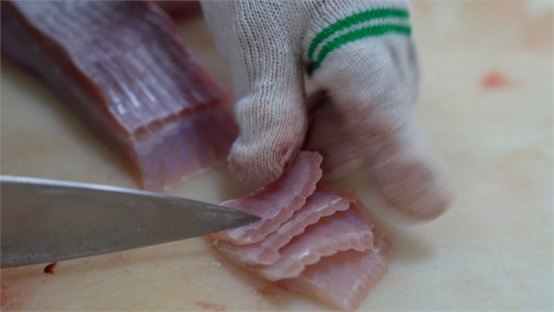 홍어 전문가께서 홍어 써는 장면(사진촬영 오현)