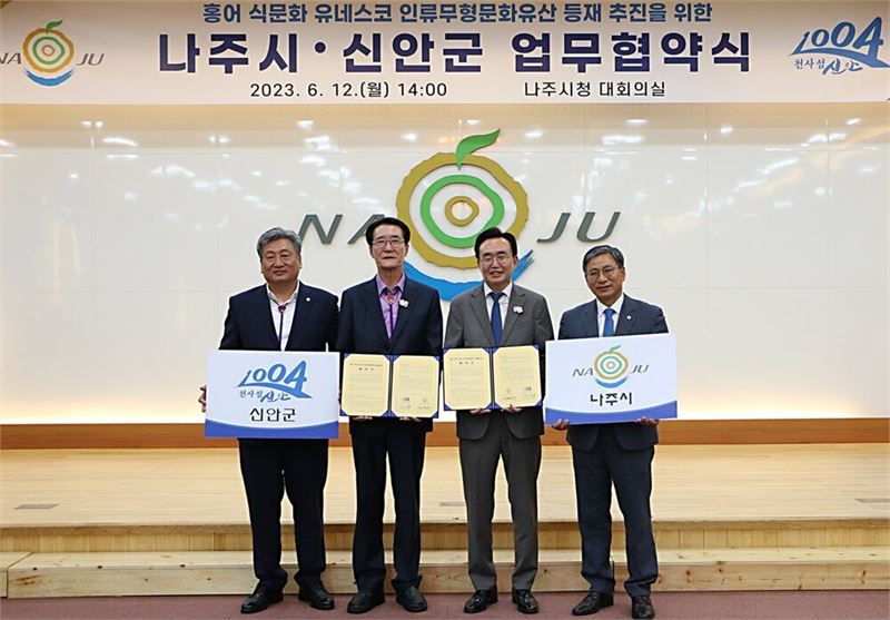 나주시·신안군 '홍어 세계화' 유네스코 인류무형문화유산 등재를 위한 업무협약식(사진제공 나주시)