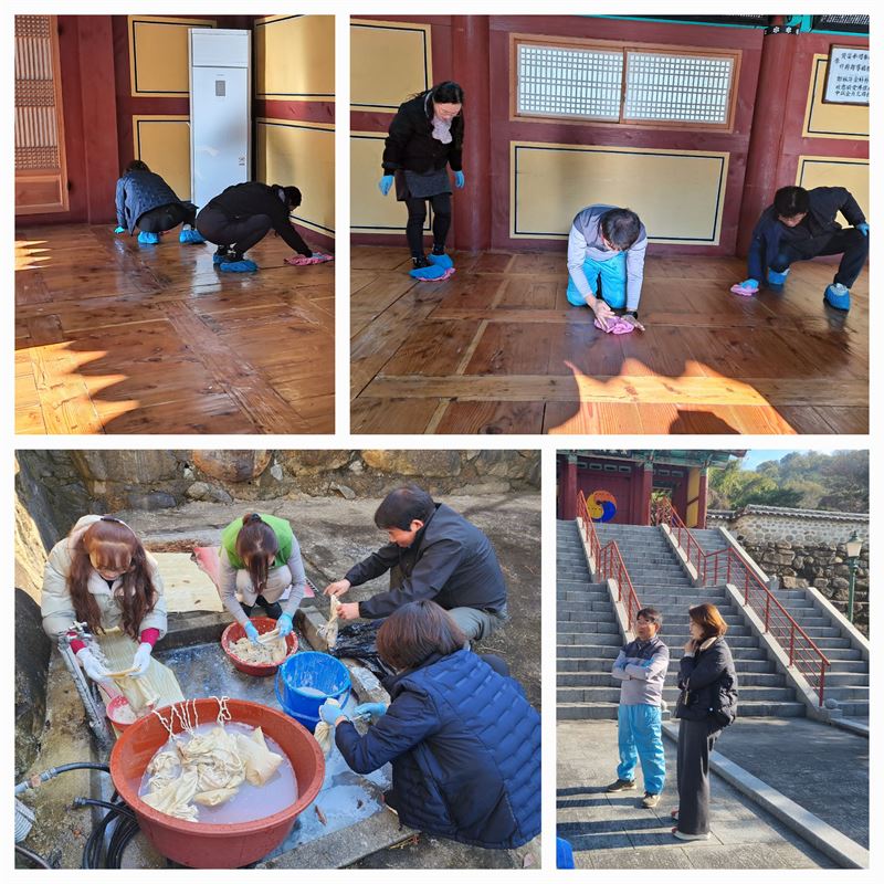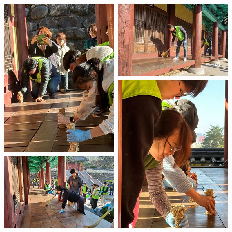 처음으로 문화재지킴이 활동에 참여한 청소년들과 기아문화재지킴이 회원, 가족들의 짚솔 청소작업 모습들...