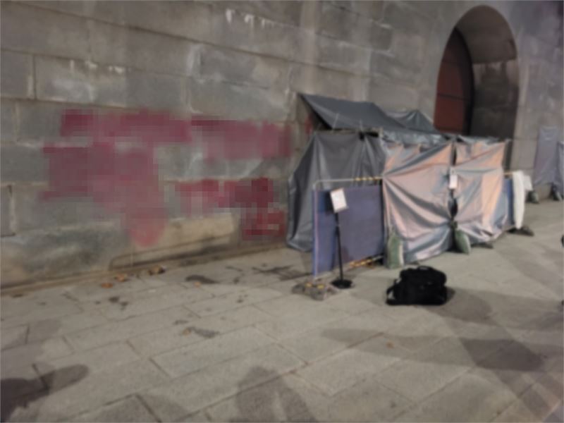 <상> 2023년 12월 17일(일) 오후 10시 19분경 신원미상의 행인이 경복궁 담장 (기존 훼손된 경복궁 서쪽의 영추문 좌측)에 스프레이 낙서로 담장을 추가로 훼손(가로 3m, 높이 2m)한 상태