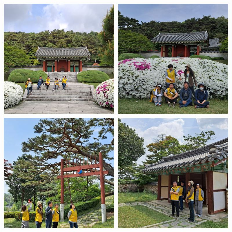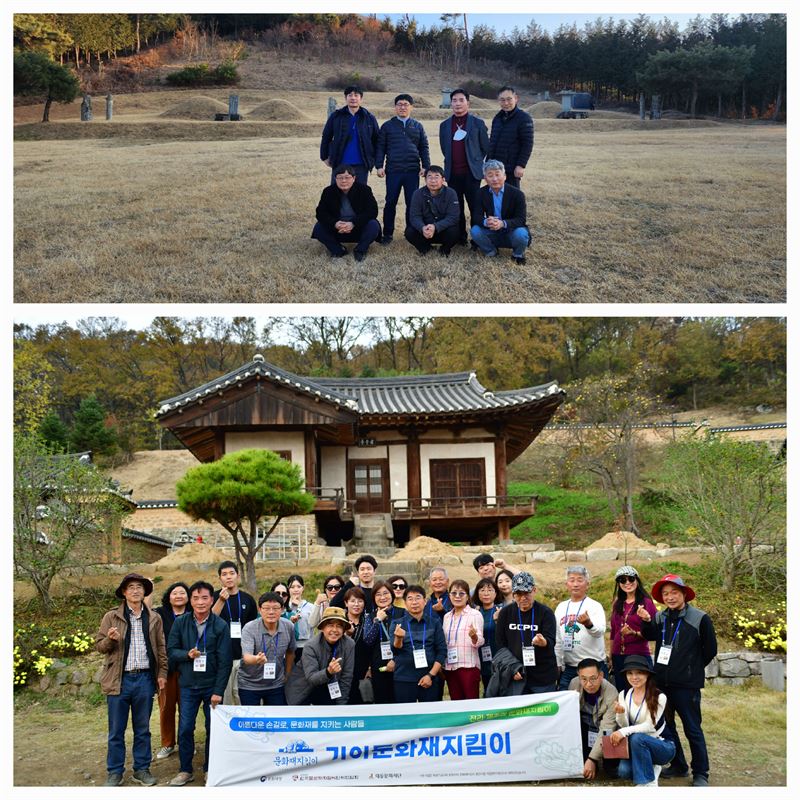 장성군 영천리에 있는 제봉 고경명 의병장의 가족묘 앞 기념사진, 안동 임청각의 군자정 앞에서 기아국가유산지킴이 회원들 기념사진(사진촬영 박정세)