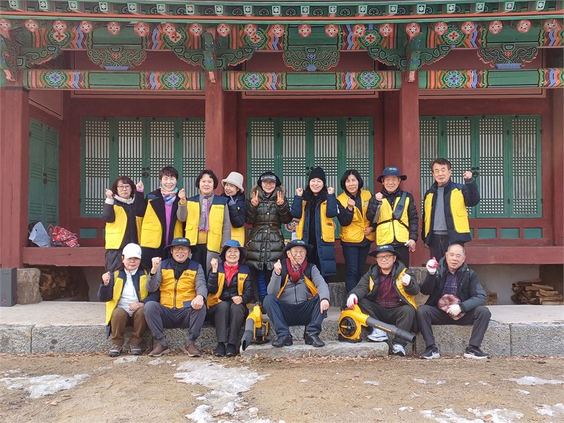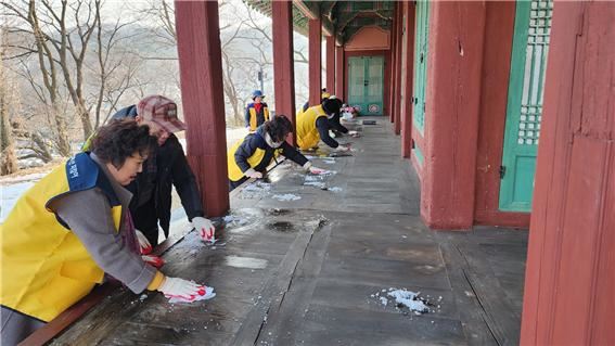 이후 침괘정으로 이동하여 송풍기로 툇마루와 문틀에 쌓인 묵은 먼지와 눈을 털어내고 주변 서식 조류에 의한 분변 제거를 진행했다.
