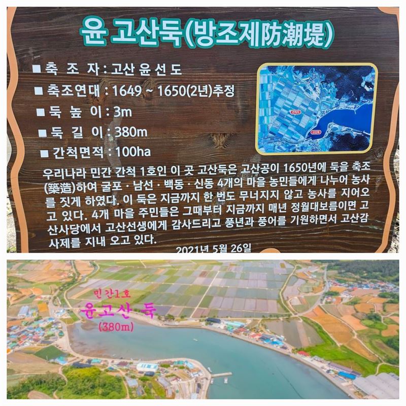 우리나라 민간 간척 1호인 고산둑 전경과 설명 표지판(사진제공 네이버 검색)