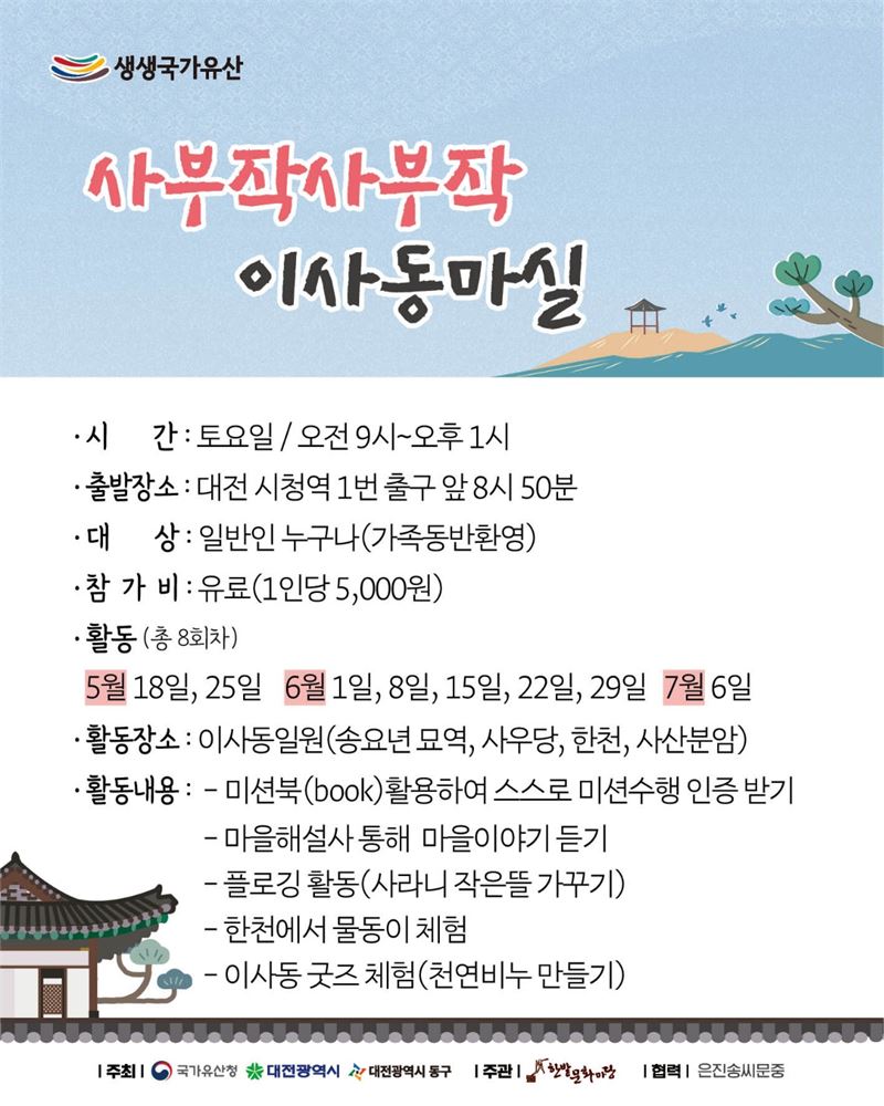 그 중에서 <사부작 사부작 이사동 마실>은 5월18일부터 7월6일까지의 기간 매주 토요일에 진행되는데 이사동 마을과 묘역을 산책하며 곳곳에 스며있는 이야기들을 만나고 마을 주민들의 이야기도 들으며 마을을 여유롭게 돌아보는 프로그램으로 이사동의 매력을 발견하는 입문 과정으로 추천할 만하다.