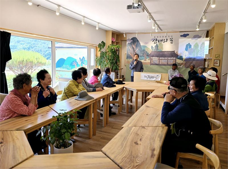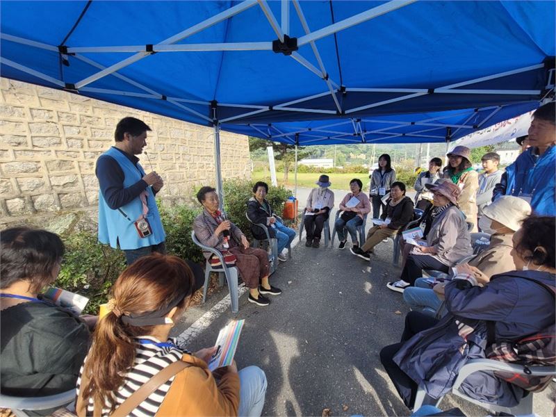마을 탐방객에 마을 이야기를 들려주는 마을 주민 해설사