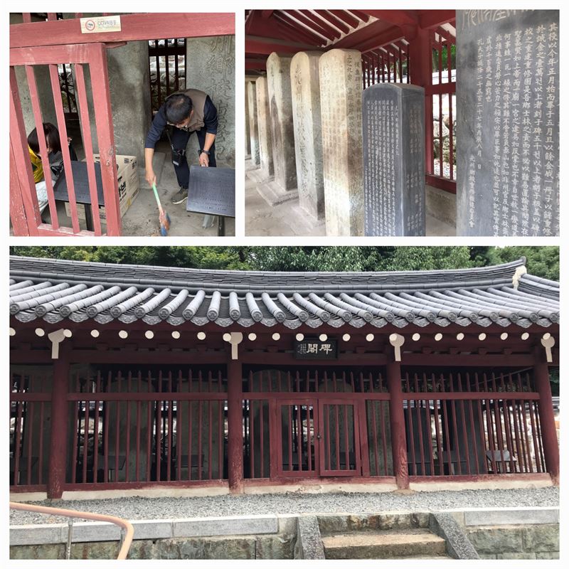 광주향교의 비각 안의 비석들 주위를 청소하는 광주문화유산지킴이들과 비각 전경