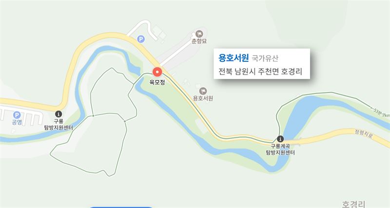 이곳에서 다시 출발해 정령치를 내려와 구룡계곡의 끝자락에 모여있는 육모정과 춘향이 묘, 용호서원이 같은 공간에 자리를 잡고 있다.