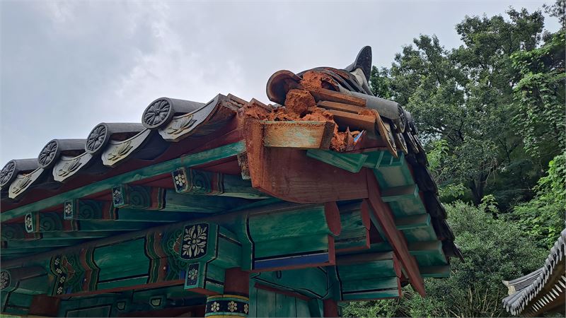 장마로 인한 지붕기와 훼손된 부분