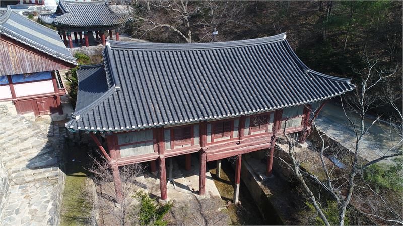 특히, 계곡의 양쪽 기슭(양안)을 가로질러 배치되어 있으며, 3쌍의 긴 기둥이 계곡 바닥에서 누각을 떠받치고 있고, 기둥과 기둥 사이의 간격(주칸)을 넓게 배치한 점 등이 기존의 사찰누각과는 다른 독특한 구조로 자연과의 조화를 잘 이루고 있어 학술적, 예술적 가치가 크다.