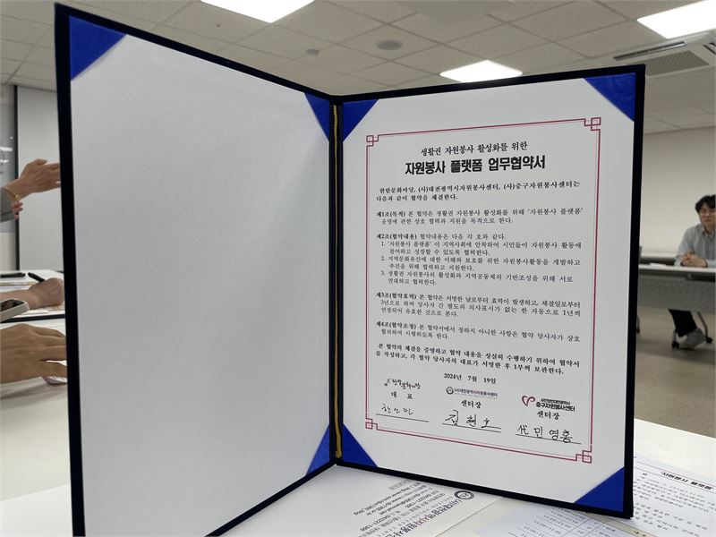 한밭문화마당(대표: 한소민)은 대전시 자원봉사센터로부터 자원봉사 플랫폼 업무를 위탁받고 오늘 협약식을 가졌다.