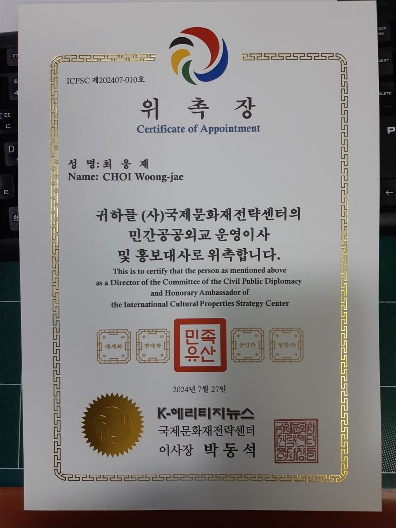한편, 이번 위촉장을 전달한 ‘(사)국제문화재전략센터’는 한국 문화재의 세계화를 위한 조사·연구, 보존·관리, 교육·활용, 홍보·진흥 및 글로벌 네트워크 전략 등 마련하는일을 설립목적으로 문화체육관광부 및 국가유산청 소관 비영리법인의 설립 및 감독에 관한 규칙을 근거법령으로 설립된법인이다.