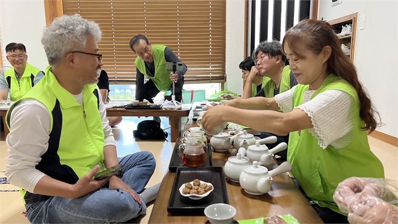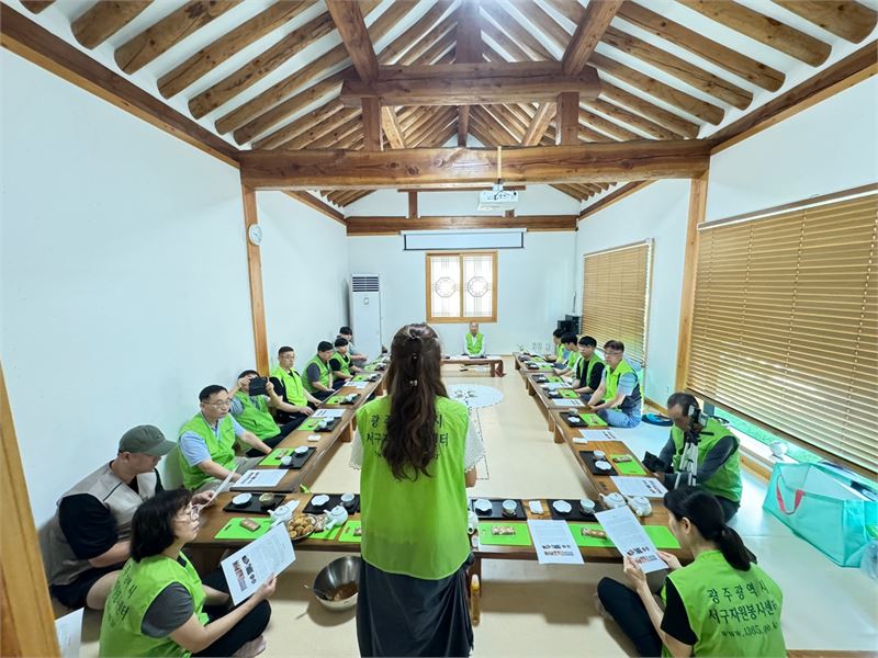 벽진서원 사랑채에 모인 기아국가유산지킴이와 광주서구자원봉사센터 임영희센터장과 직원 그리고 청소년이 함께한 다식만들기 체험