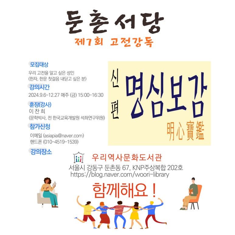 이번 <둔촌서당> 7기에서 읽을 고전은 대표적인 동몽서(童蒙書, 아동용 학습서)로 알려져 있는 《명심보감(明心寶鑑)》이다. ‘명심’이란 말 그대로 마음을 밝게 한다는 뜻이며, ‘보감’은 보물과 같은 거울로서의 교본이 된다는 것을 뜻한다. 그 내용은 경서(經書)·사서(史書)· 제자(諸子)·시문집 등 여러 책에서 적절히 뽑아가린 좋은 구절들이 들어 있어 수백년 동안 즐겨 읽혀지면서 우리 민족의 정신적 가치관 형성에 일익을 담당하였다. 이번 교재가 되는 《신편 명심보감》은 기존의 《명심보감》에 우리나라 선인들의 금언, 명구를 모아 〈한국편〉으로 추가하여 편찬한 것이다.