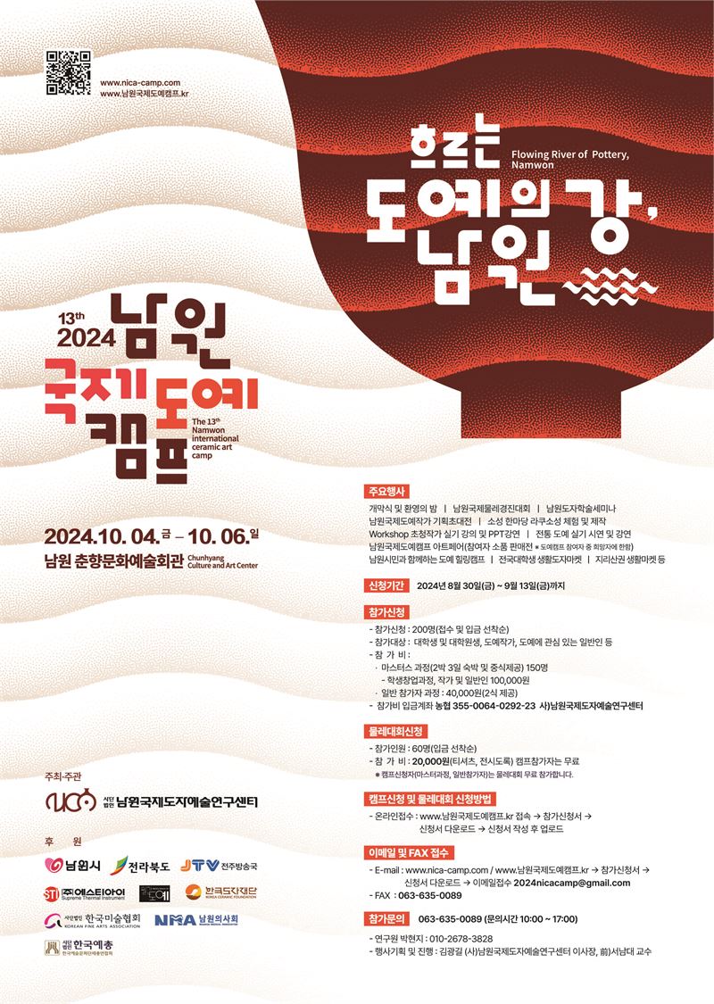 남원국제도예캠프가 올해 13회를 맞이하여 '흐르는 도예의 강, 남원 (Flowing River Pottery, Namwon)' 이라는 주제로 2024년 10월 04일(금) ~10월 06일(일)까지 2박3일로 개최된다. 이번 캠프는 역대 최대 규모의 국내외 도예 작가들이 참여하여 더욱 풍성한 프로그램으로 진행 될 예정이다.