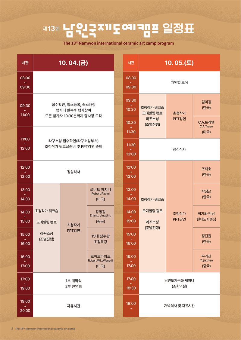 • 장소 : 남원춘향문화예술회관, 온라인 www.nica-camp.com/www 남원국제도예캠프.kr