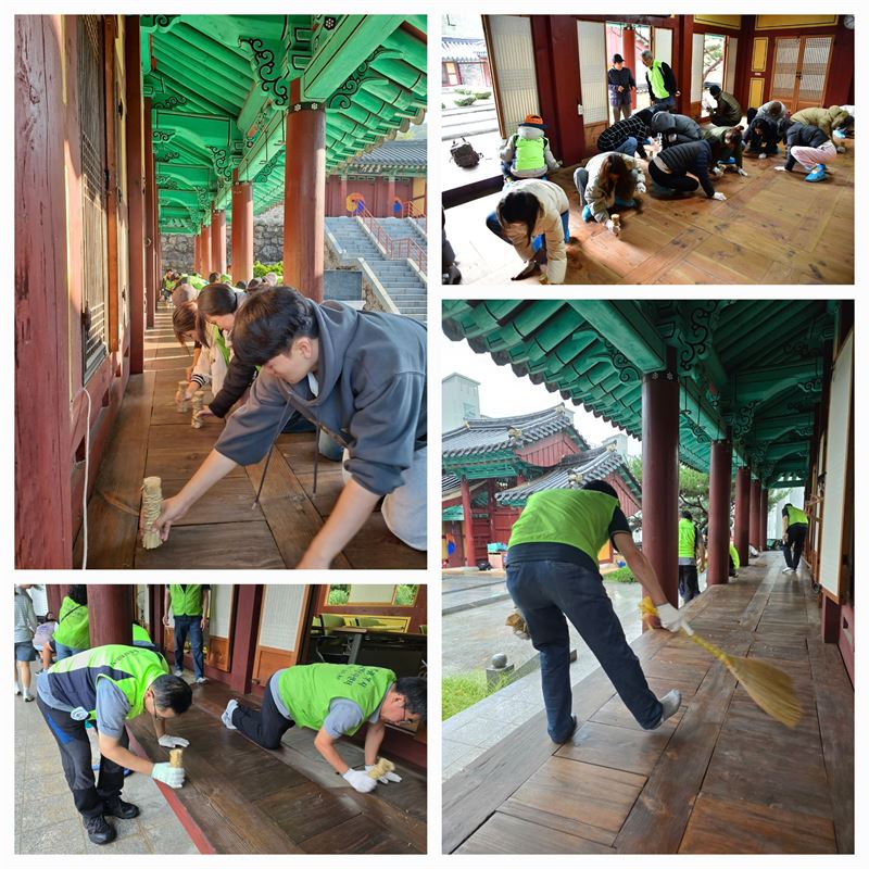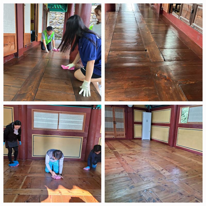 콩댐작업 전에 벽진서원 숭본당 내부와 마루에 찌든 먼지를 짚솔로 청소하는 모습