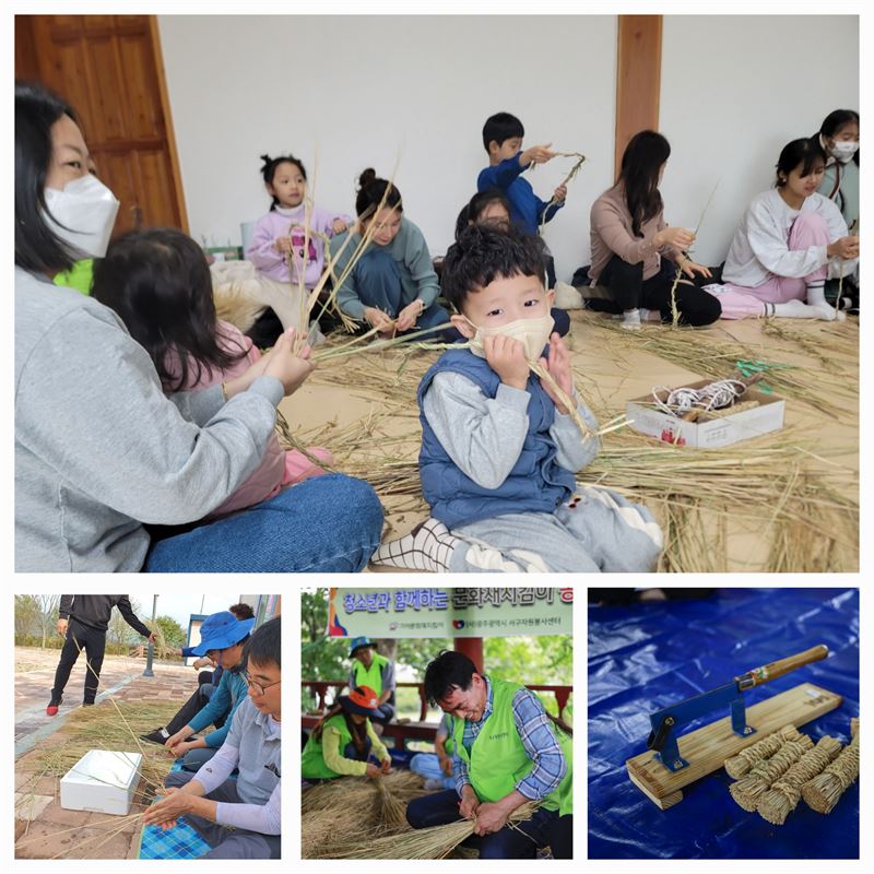 콩댐작업 전에 볏짚으로 짚솔을 만드는 삼성생명 가족들과 기아국가유산지킴이 회원들의 모습