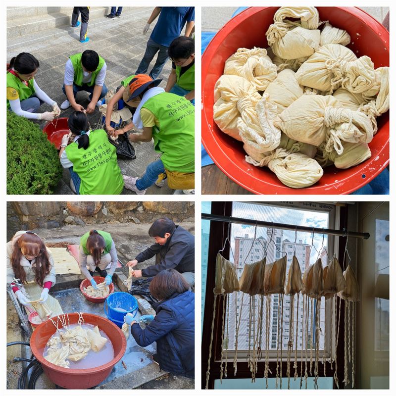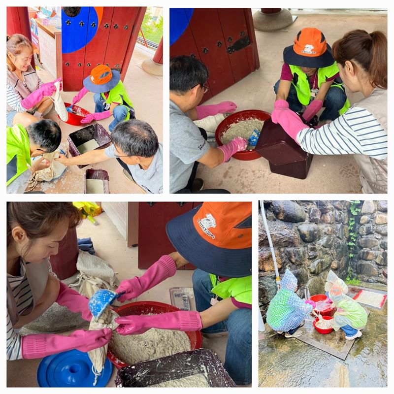 콩댐작업 후 광목천 안에 있는 생콩과 생들깨 찌꺼기를 제거하고 광목천 세척하는 기아국가유산지킴이 회원들