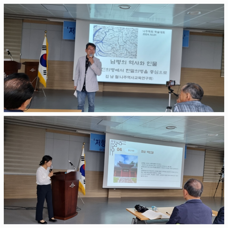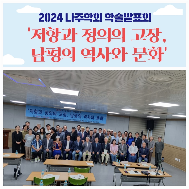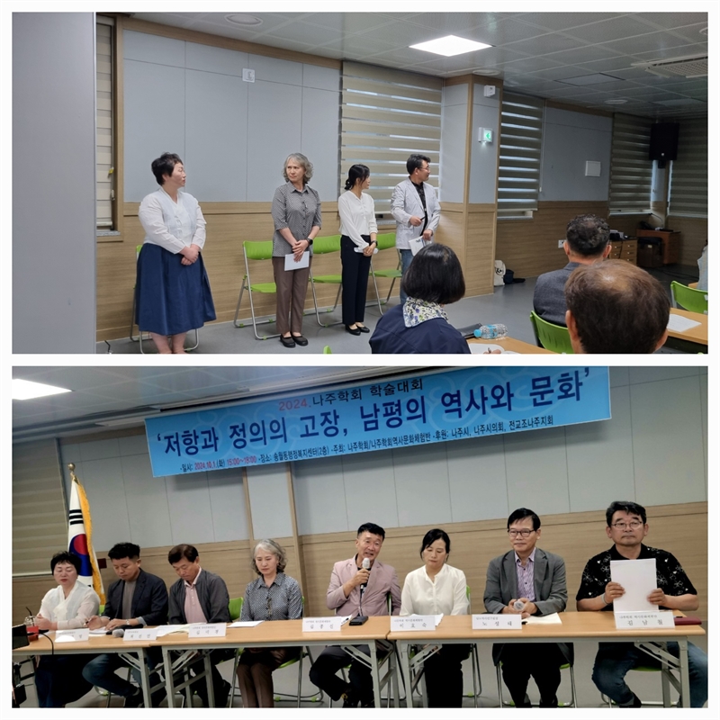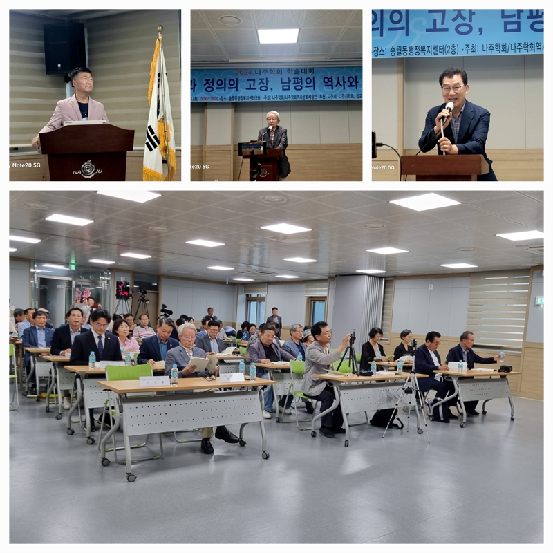 나주학회 역사체험반이 주최하고 나주학회가 주관하는 '저항과 정의의 고장 남평의 역사와 문화' 학술발표회가 10월 1일(화) 오후 3시부터 송월동 행정복지센터 2층에서 성황리에 마무리되었다. 이번 행사는 남평 지역의 역사와 문화적 특징을 심도 있게 살펴보고, 지역 정체성 확립을 위한 발판을 마련하고자 기획되었다.