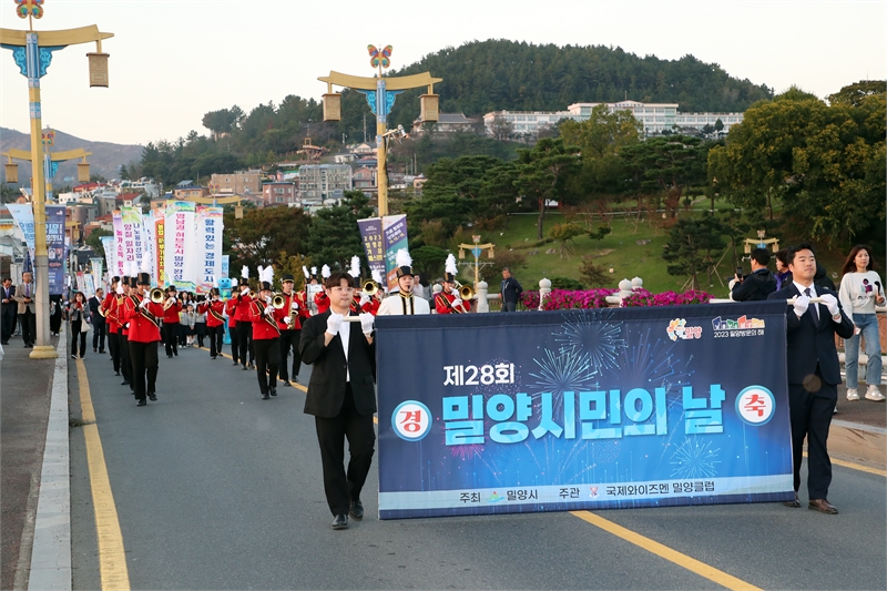 17일 오후 5시부터는 국제와이즈멘 밀양클럽(회장 최관식) 주관으로 제29회 밀양시민의 날 기념행사가 열린다. 이날 행사는 △16개 읍면동 거리 퍼레이드 △식전공연 △기념식 △시민 한마당 축제 △열린음악회 순으로 진행된다. 식전 공연은 내일동 주민자치프로그램 색소폰, 지역 가수 등 주민참여 공연으로 펼쳐지고, 기념식은 시민헌장 낭독, 제26회 밀양시민 대상시상(문화 부문 고 박노태, 산업 부문 윤종국, 봉사 부문 손인상)과‘밀양을 빛나게 시민을 행복하게’비전 선포식이 진행될 예정이다.