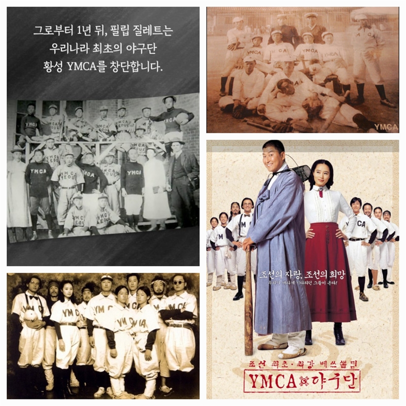 1904년 일제강점기에 창단된 우리나라 최초의 야구단 '황성 YMCA' 야구단을 만든 선교사로 온 미국인 질레트(P. L. Gillett)와 함께 찍은 사진과 영화로 제작 된 출연진 포스터(사진제공 네이버 검색)