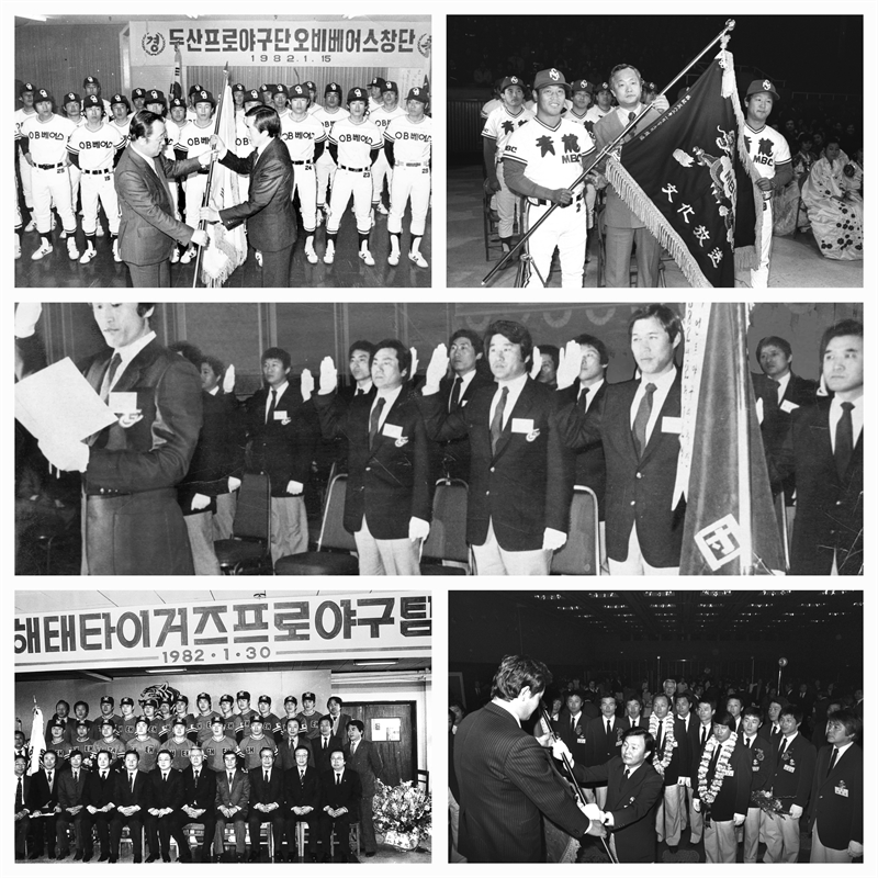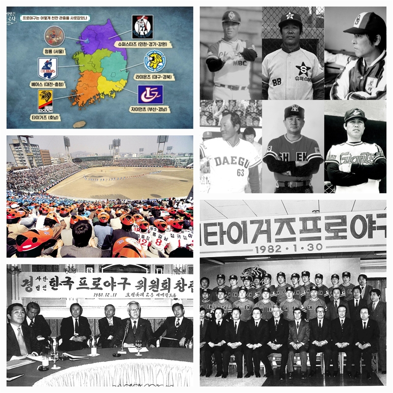 KBO 최초 6개 각구단의 위치와 엠블럼, 초대 감독들, 한국프로야구 창립 총회 등의 모습